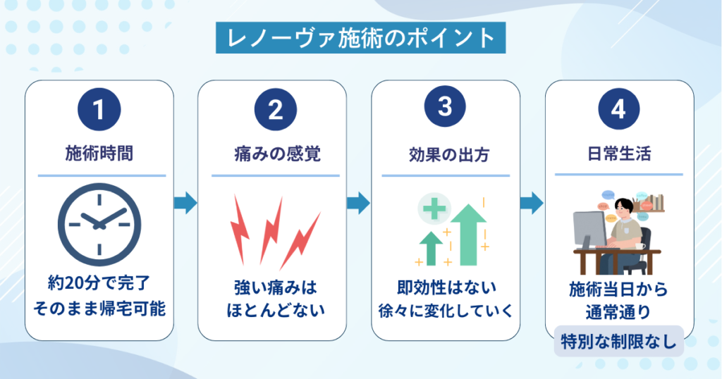 レノーヴァの施術は、受付から会計まで全体で1時間程度が目安です。施術自体は20分ほどで終わり、そのまま帰宅できます。当日から性行為やシャワー・入浴も問題なく、日常生活への制限はありません。