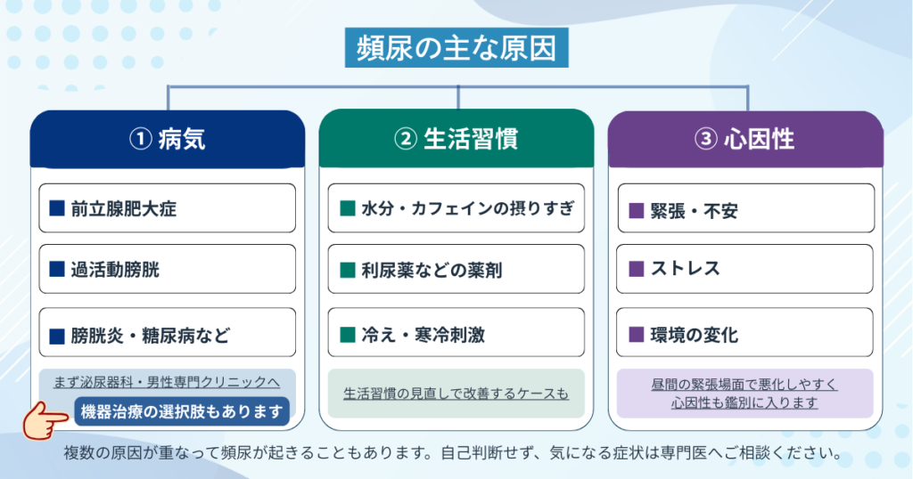 男性の頻尿には、前立腺の変化や過活動膀胱が関係していることが多いとされています。また、骨盤底筋の機能低下が関与するケースもあります。
