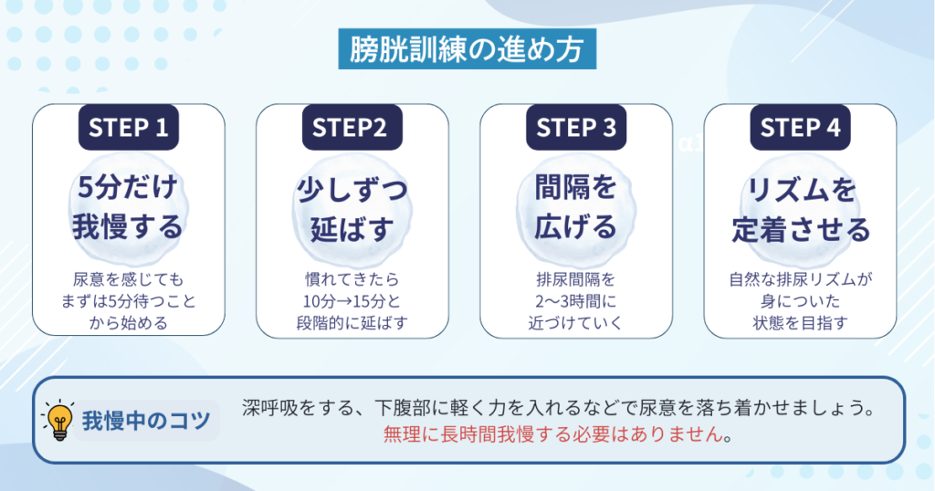 - 最終的に2〜3時間ごとの排尿リズムを目標にする