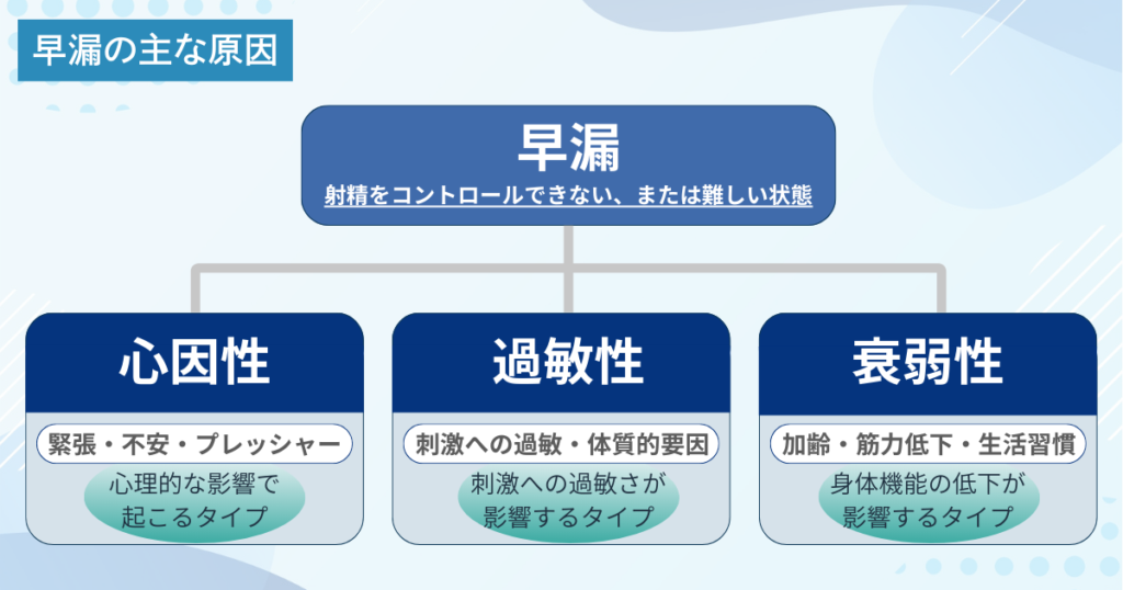 一口に「早漏」といっても、その原因は人によって異なります。臨床的には主に3つのタイプに整理されることがあり、タイプによって有効なアプローチが変わります。