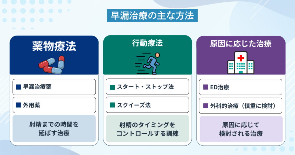 早漏治療の主な方法は早漏治療薬・行動療法が中心で、EDが関係している場合はED治療薬や衝撃波治療が検討されることもある