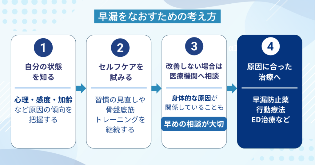 心因性の早漏であれば、不安や緊張が和らぐことで症状が軽くなることもあります。一方、身体的な要因が関係している場合は、セルフケアだけで改善しにくいこともあります。「様子を見る」より、原因に合ったアプローチをとることが大切です。