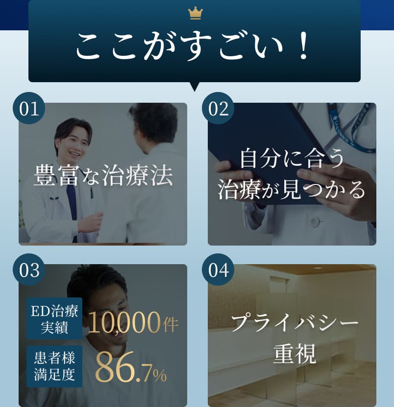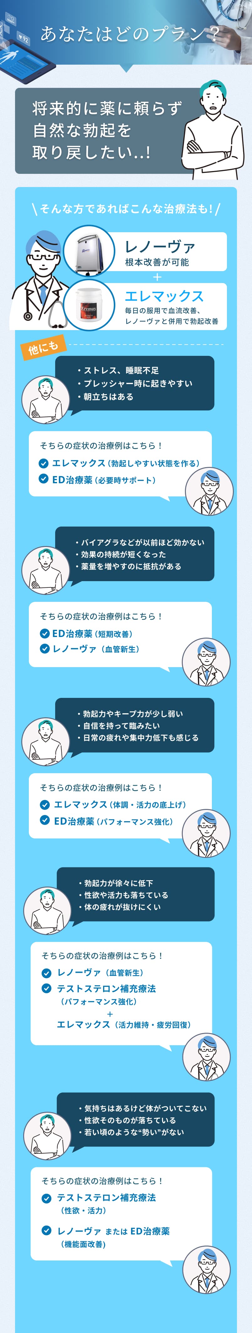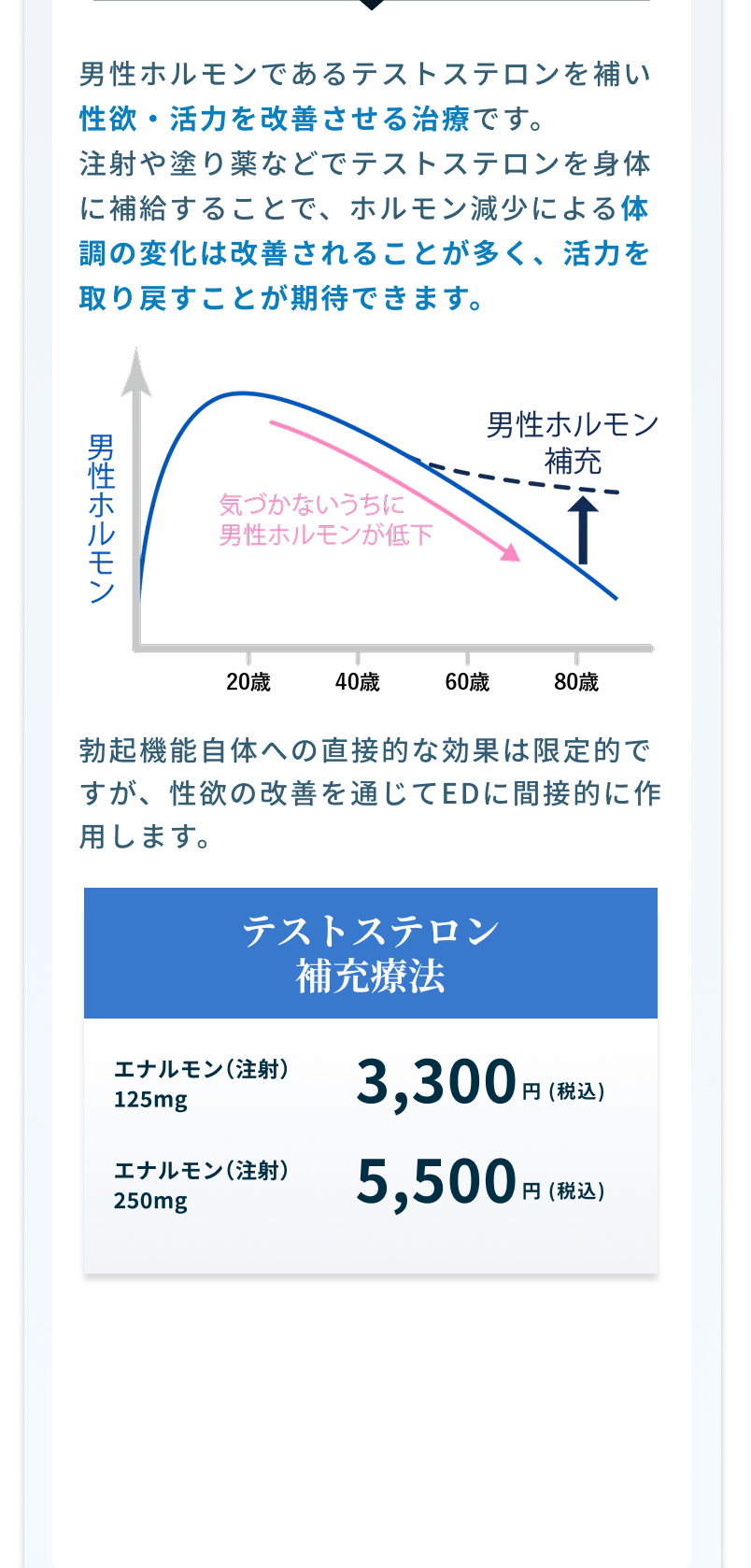 可能です。患者様のご希望や状態にあわせ、ホルモン補充療法やED治療薬、漢方薬、サプリメントなどの治療をご提案いたします。