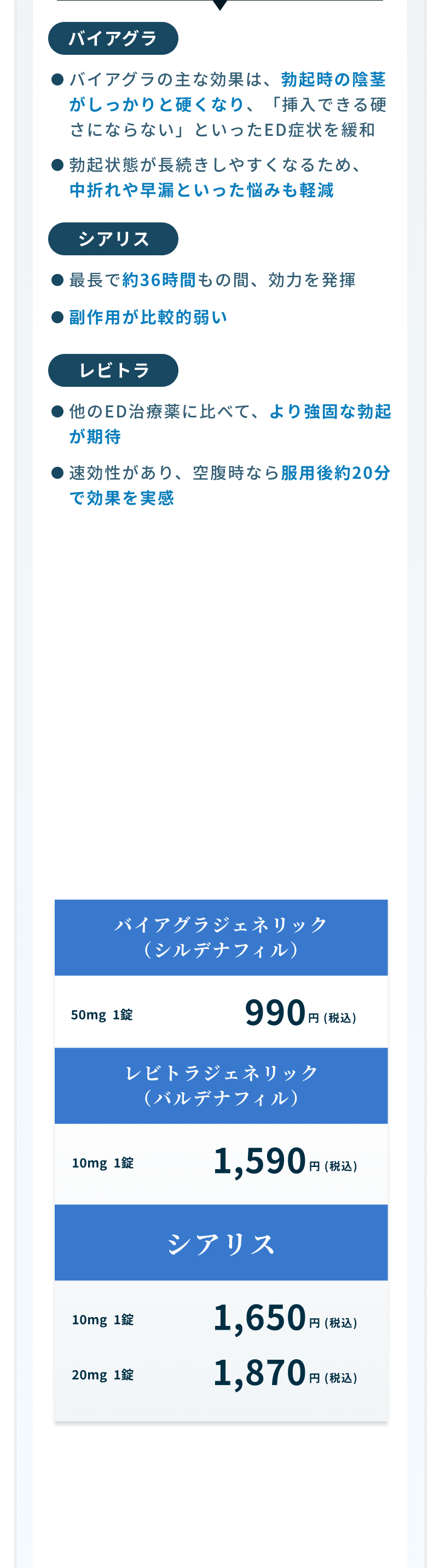 頭痛・ほてり等が起きる場合があります。ED内服薬は、血管を広げて血流を良くすることで勃起を促します。そのため、副作用も「血管が広がる」ことに起因する、一時的で軽い症状が主です。
