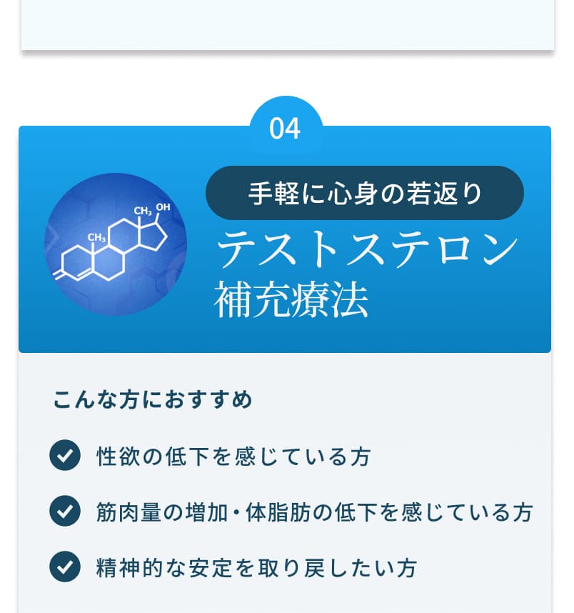 テストステロン補充療法の終了時期は個々の状況によります。通常、注射は3〜4週間ごとに行いますが、その都度治療の成果と副作用を評価し、治療の継続、または終了を検討します。