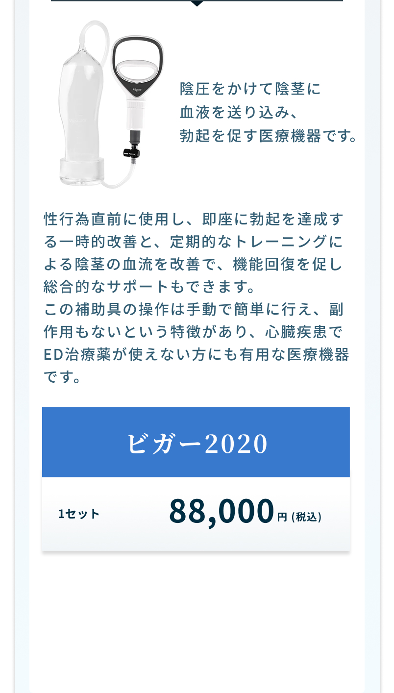 発送も可能ですが、Vigor(ビガー)2020は、医師の指示に基づいて購入可能商品です。診察後に、直接持ち帰りまたは郵送が選べます。医師と相談してください。