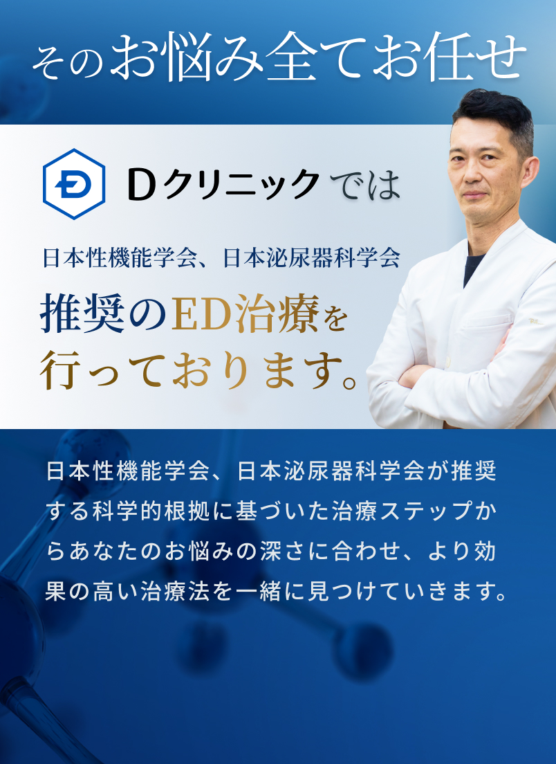 服用しているお薬によっては、ED治療薬との併用ができないものがあります。必ず問診の際に、現在服用しているすべてのお薬をお教えください。Dクリニックでは、安全性を最優先し、専門医が細かくチェックいたします。